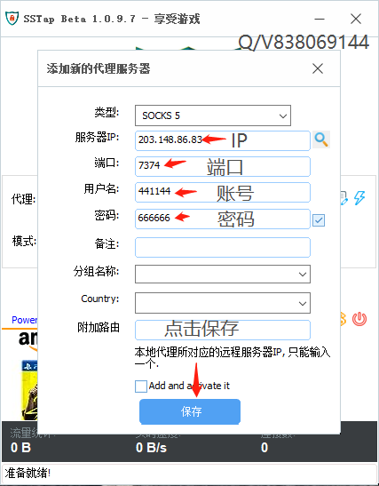 1.软件下载到电脑桌面打开软件 1.点击下载软件 2.客服QQ. 838069144 3.客服微信. 838069144 2.下载完成软件点击+号选择socks5 3.输入ip 端口 账号 密码 点击保存 比如这条IP 203.148.86.83|7374|441144|666666|2023-10-29 203.148.86.89是IP 7374 是端口 441144 是账号 666666是密码 4.点击链接即可 请严格遵循中华人民共和国法律法规行为,任何使用本软件造成的后果由使用者个人承担,必要情况下站长将竭力配合网监部门协助调查。 售后客服QQ 售后客服微信